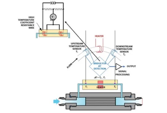 1. 传感器部分:包含一个加热元件(如热丝)和一对温度检测元件。加热元件以恒定功率加热,当气体流过加热元件时,会带走部分热量,导致加热元件周围温度下降。这一温度变化与通过的气体质量流量成正比。