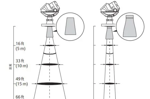 雷达液位计的总波束宽度与设备的频率成反比。因此对于同一直径的天线,如果雷达液位计的频率提高,波束宽度将低于较低频率的设备,狭窄的波束可将管嘴、罐壁和干扰物的影响降至最低。如下图所示(左侧是6 GHZ的,右侧为26GHZ的)。