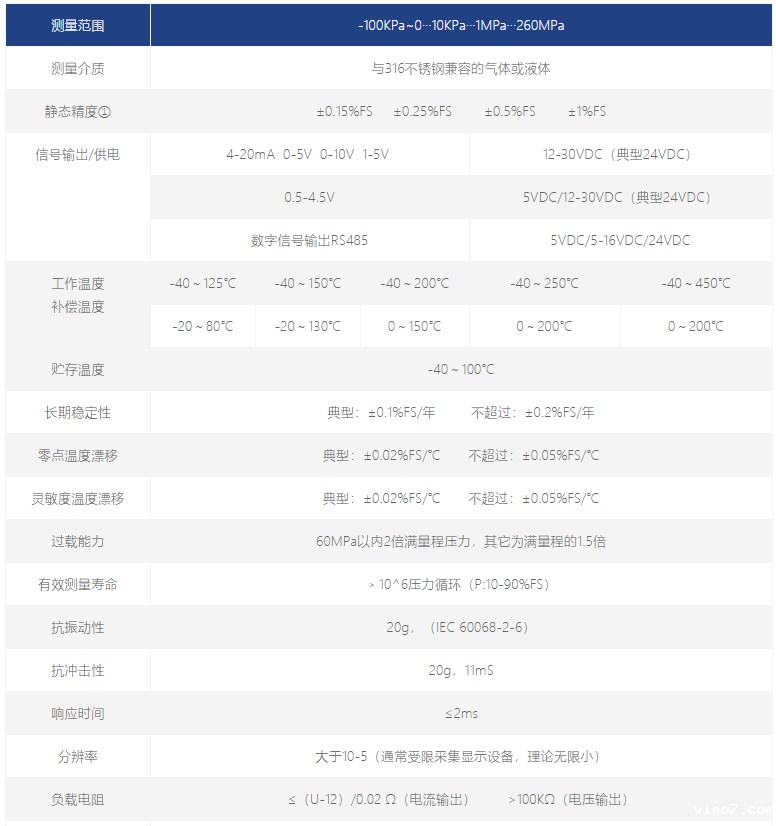 高温压力传感器性能指标: